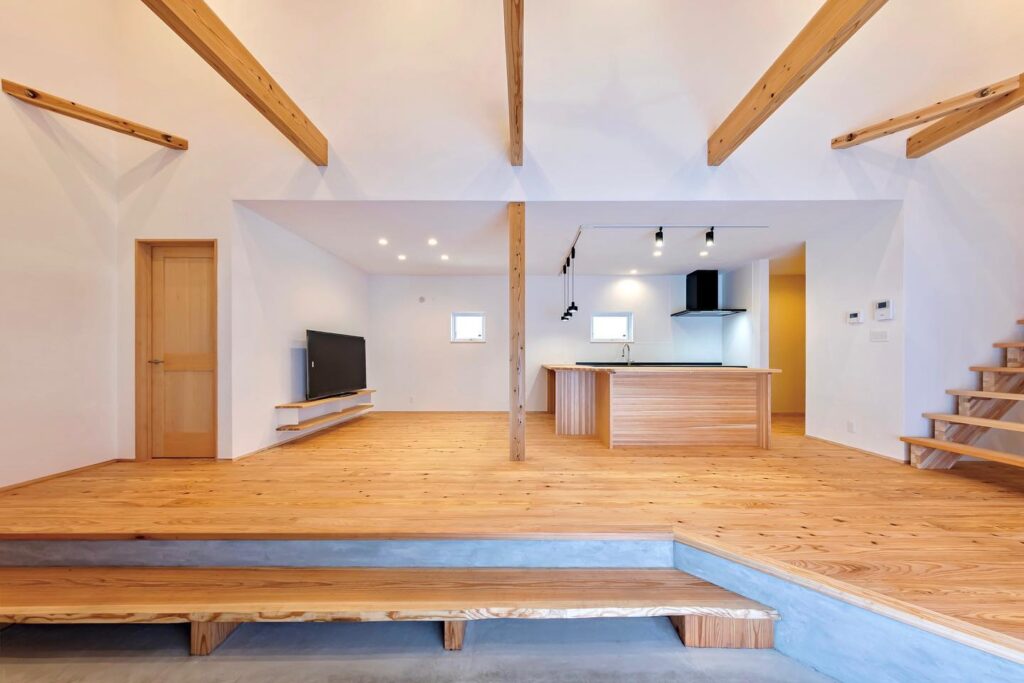 玄関から続く広い土間でゆるくゾーンを分けたLDKの、リビングからキッチン方面を望む。階段ホールを兼ねた土間は丸ごと吹き抜け。